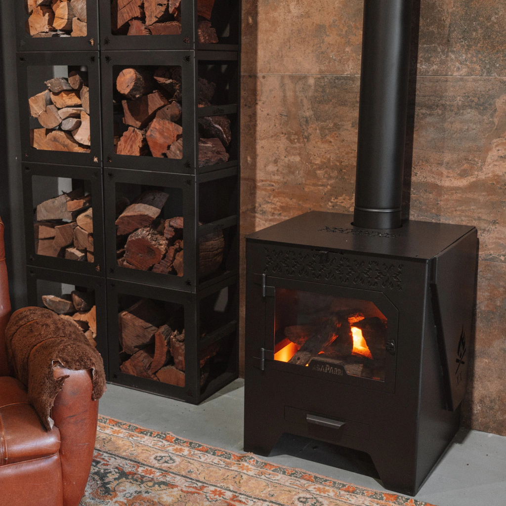 El porta leña es clave para tenerlo al lado de tu salamandra o parrilla. Tambien esta planteado para poder trasladarlo.
